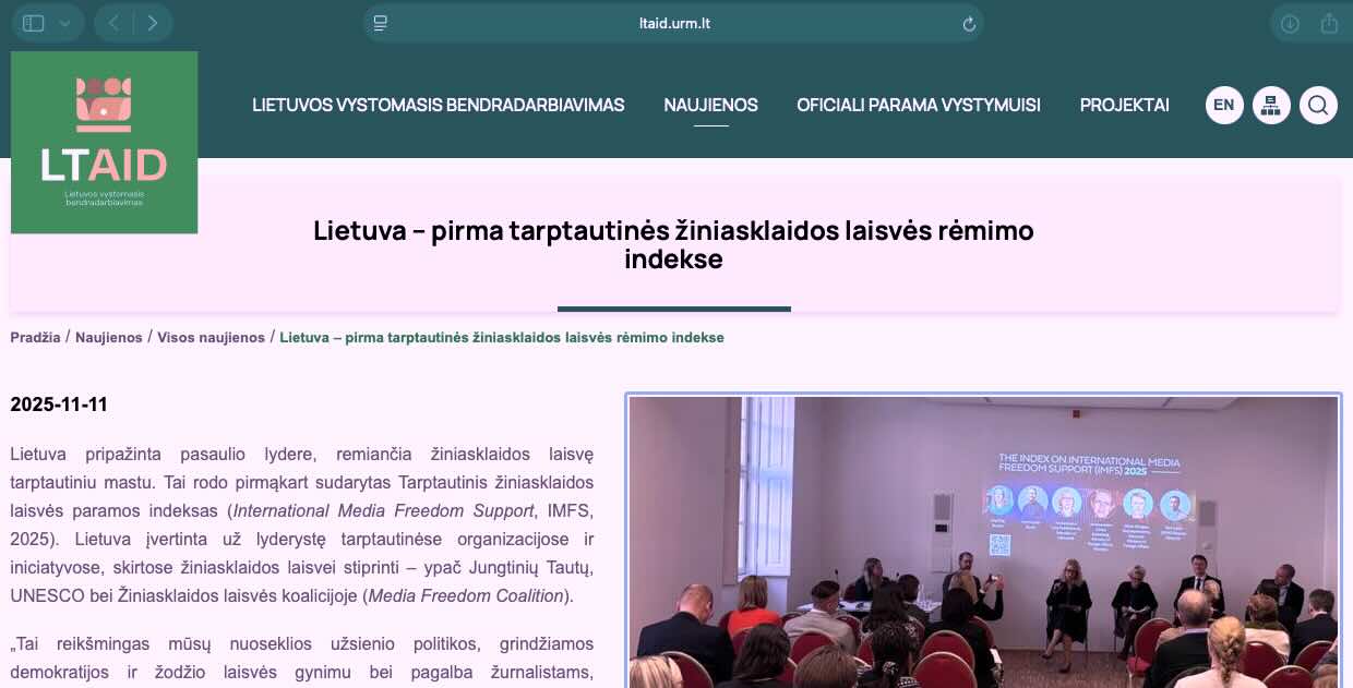 Informuojama, kad „tai rodo pirmąkart sudarytas Tarptautinis žiniasklaidos laisvės paramos indeksas (International Media Freedom Support, IMFS, 2025). Lietuva įvertinta už lyderystę tarptautinėse organizacijose ir iniciatyvose, skirtose žiniasklaidos laisvei stiprinti – ypač Jungtinių Tautų, UNESCO bei Žiniasklaidos laisvės koalicijoje (Media Freedom Coalition).