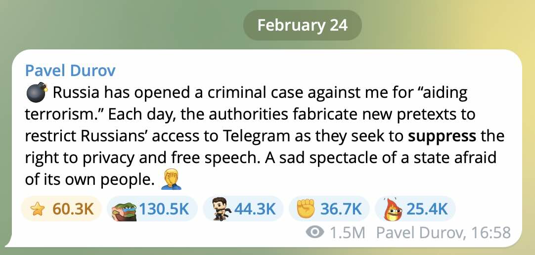 „Rusija man iškėlė baudžiamąją bylą dėl „pagalbos terorizmui“. Kiekvieną dieną valdžia išgalvoja naujus pretekstus riboti rusų prieigą prie „Telegram“, siekdama slopinti teisę į privatumą ir žodžio laisvę. Liūdnas vaizdas – valstybė, bijanti savo pačios žmonių“, - TELEGRAM tinkle parašė P. Durovas.
