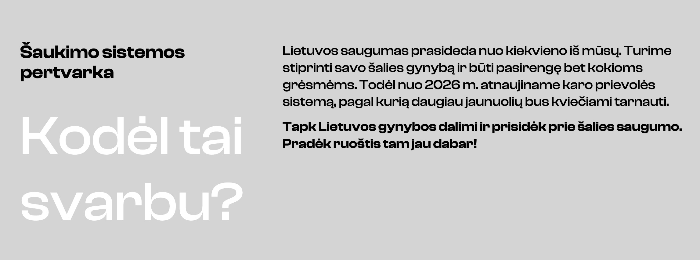 Rusijos karinei invazijai į NATO ir Europos Sąjungos (ES) valstybę Lietuvą vis labiau artėjant, nuo 2026 metų sausio 1 d. įsigalioja nauja privalomosios pradinės karo tarnybos (PPKT) sistemos tvarka, orientuota į didesnį parengtų piliečių skaičių, spartesnį aktyviojo kariuomenės rezervo formavimą ir tarnybos patrauklumo didinimą jauniems žmonėms.