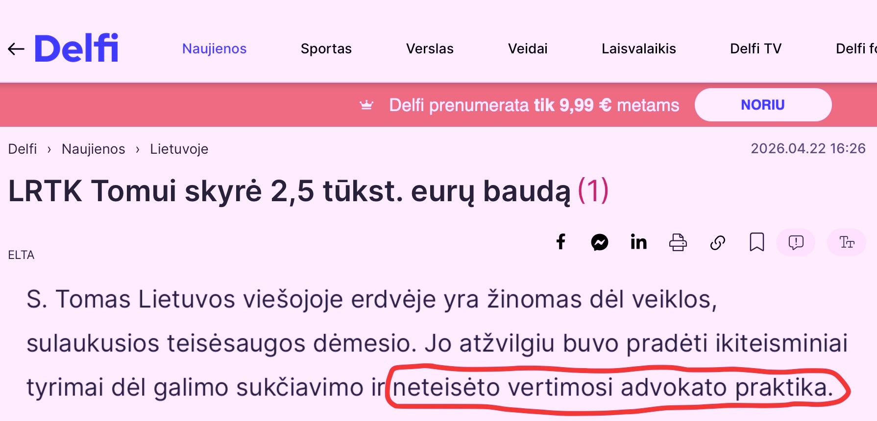 Atskirai pažymėtina, kad 2026 m. balandį Lietuvos radijo ir televizijos komisija, kuriai vadovauja Mantas Martišius, paskelbė skyrusi S. Tomui 2500 eurų baudą ne dėl pensijų klausimo ar kreipimosi į Jungtines Tautas, o dėl kito jo „YouTube“ įrašo, kuriame buvo kalbama apie asociaciją „Lietuvos šaulių sąjunga“.
