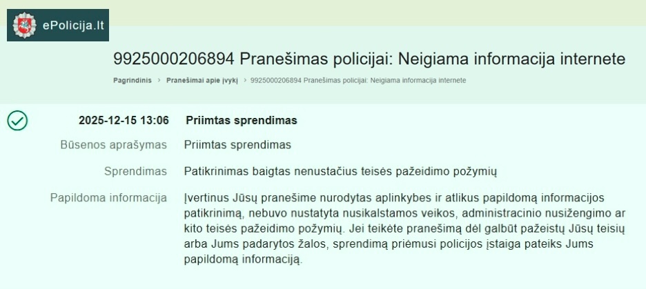 „Atlikus papildomą informacijos patikrinimą, nebuvo nustatyta nusikalstamos veikos, administracinio nusižengimo ar kito teisės pažeidimo požymių“, – anonimiškai informavo policija.