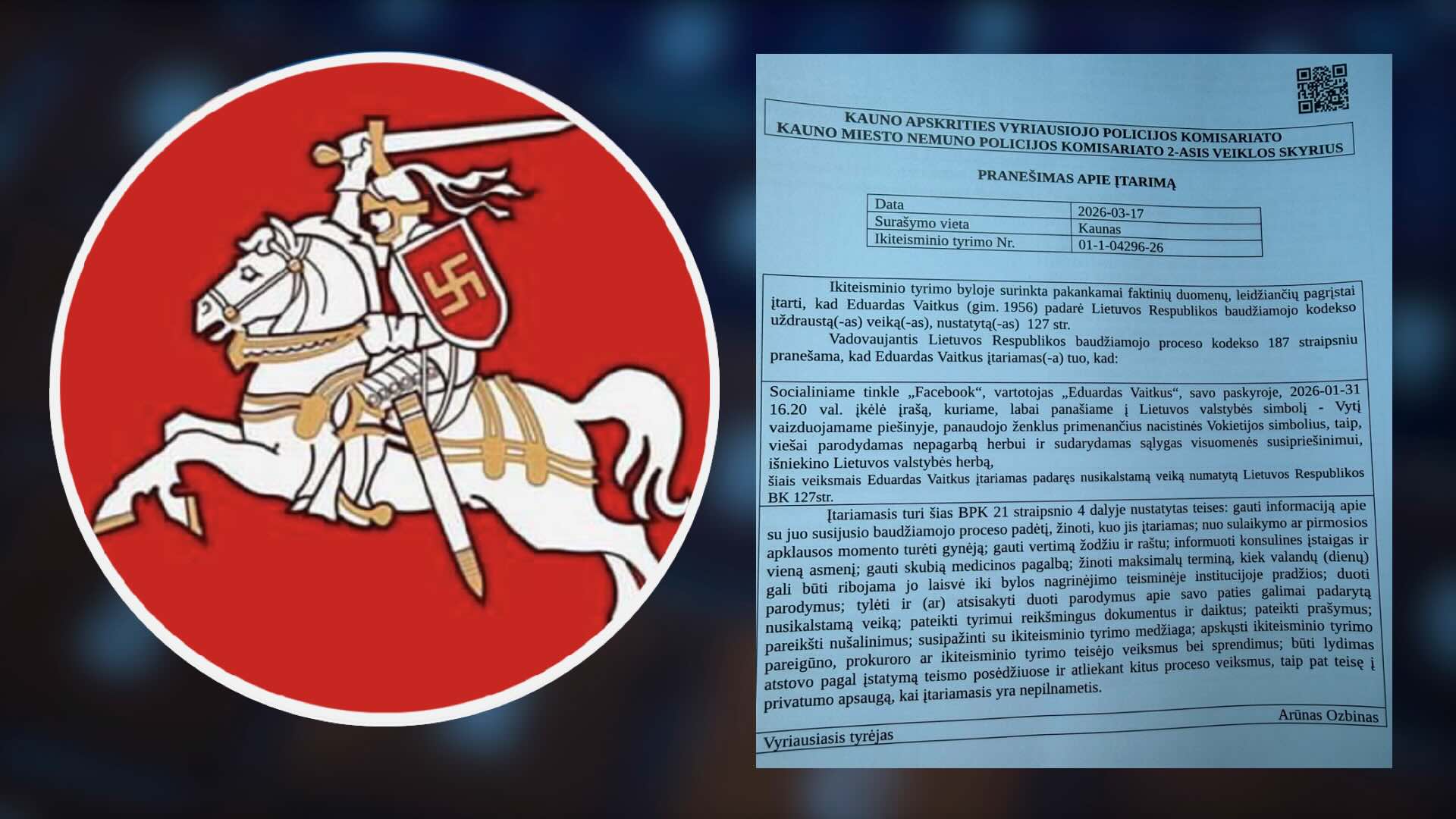Policijos dokumente teigiama, kad 2026 m. sausio 31 d. visuomeniniame tinkle „Facebook“, paskyroje „Eduardas Vaitkus“, buvo paskelbtas piešinys, panašus į Lietuvos valstybės herbą.
