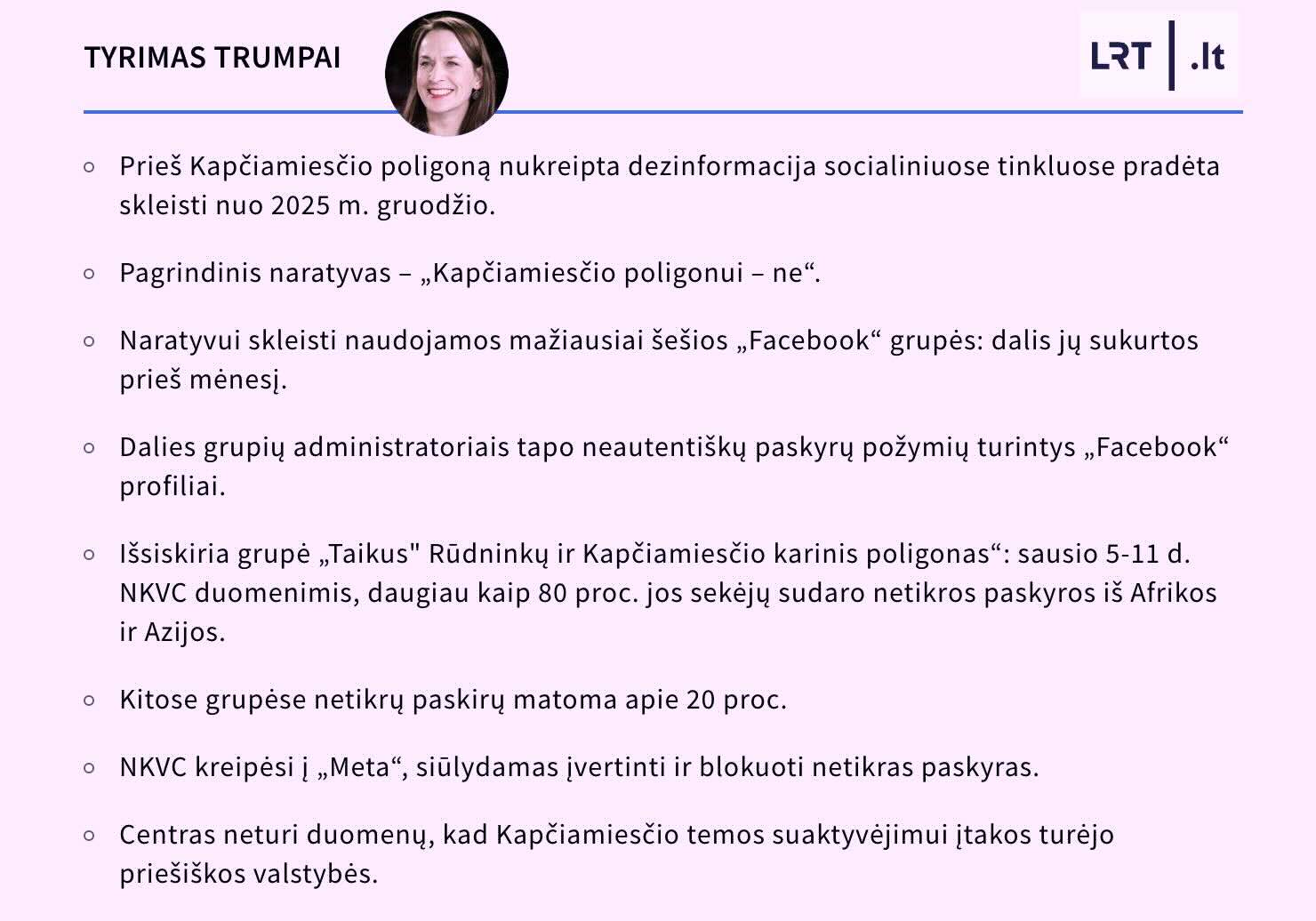 Valstybinis transliuotojas LRT atlikęs tyrimą atskleidė, kad „prieš Kapčiamiesčio poligoną nukreipta dezinformacija socialiniuose tinkluose pradėta skleisti nuo 2025 m. gruodžio“.