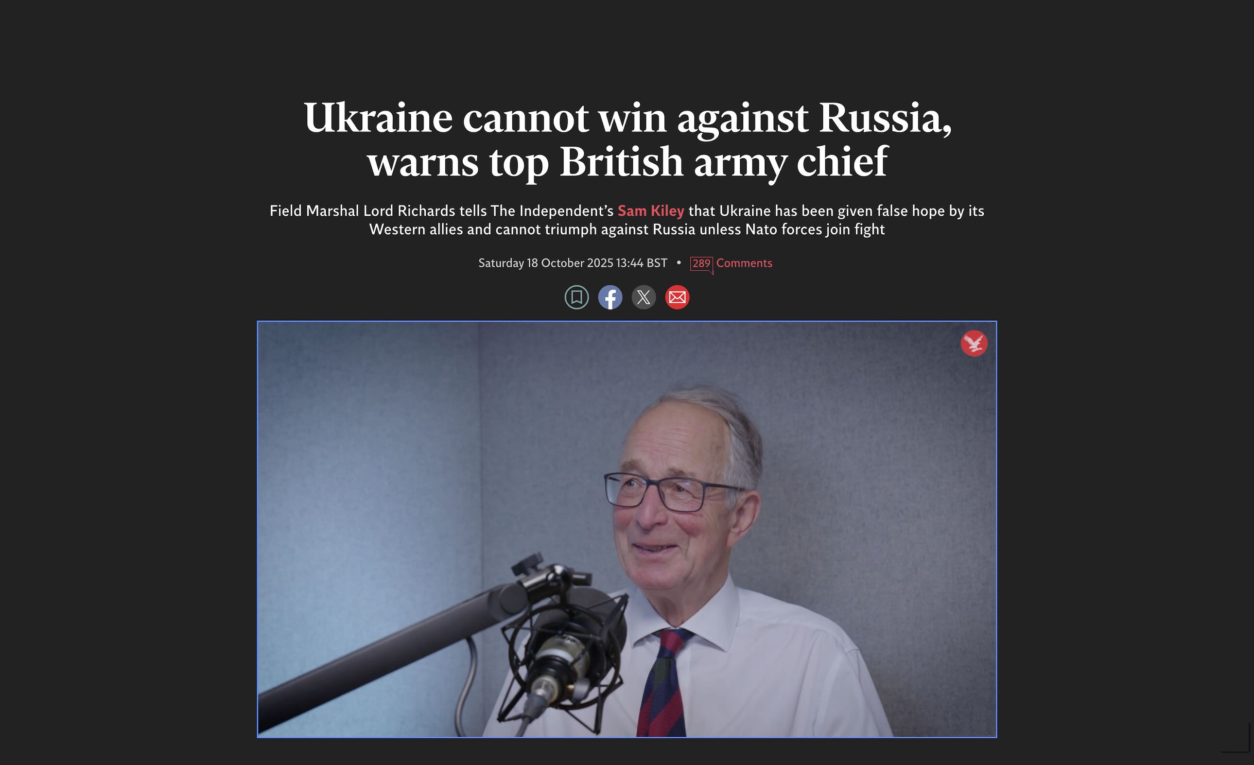 Interviu leidiniui „The Independent“ buvęs Jungtinės Karalystės generalinio štabo vadovas ir NATO pajėgų vadas Afganistane teigė, jog Ukrainos sąjungininkai skatino ją kovoti, bet neaprūpino būtinais resursais pergalei pasiekti.
