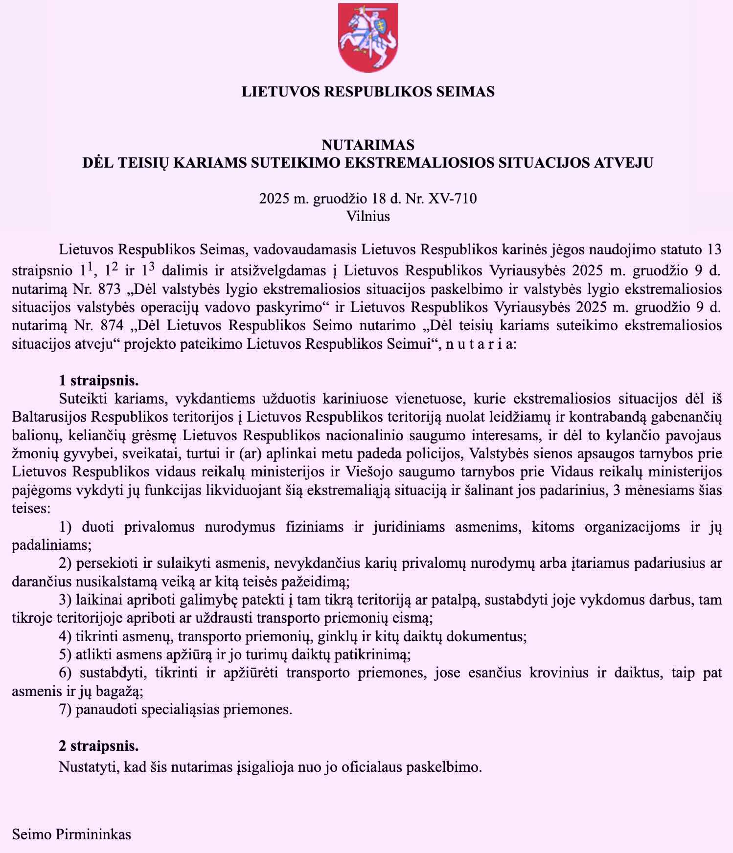 Nuo dabar kariai ekstremaliosios situacijos metu, turės teisę duoti privalomus nurodymus fiziniams ir juridiniams asmenims, kitoms organizacijoms bei jų padaliniams, persekioti ir sulaikyti asmenis, nevykdančius karių teisėtų nurodymų arba įtariamus padarius ar darančius nusikalstamą veiką ar kitą teisės pažeidimą.