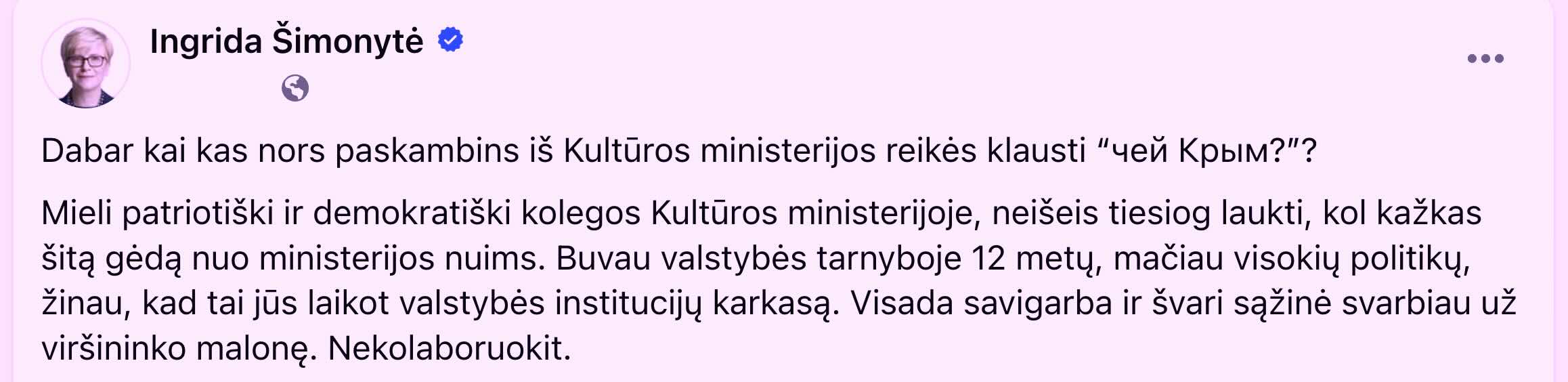 „Dabar kai kas nors paskambins iš Kultūros ministerijos reikės klausti „чей Крым?“? Mieli patriotiški ir demokratiški kolegos Kultūros ministerijoje, neišeis tiesiog laukti, kol kažkas šitą gėdą nuo ministerijos nuims. Buvau valstybės tarnyboje 12 metų, mačiau visokių politikų, žinau, kad tai jūs laikot valstybės institucijų karkasą. Visada savigarba ir švari sąžinė svarbiau už viršininko malonę. Nekolaboruokit“, - visuomeniniuose tinkluose paskelbė I. Šimonytė.