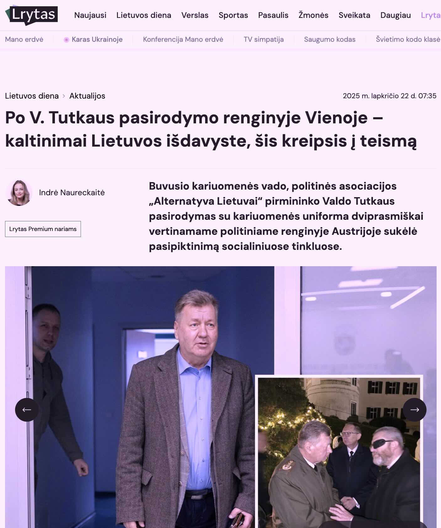 Viešojoje erdvėje skelbiama, kad „buvusio kariuomenės vado, politinės asociacijos „Alternatyva Lietuvai“ pirmininko Valdo Tutkaus pasirodymas su kariuomenės uniforma dviprasmiškai vertinamame politiniame renginyje Austrijoje sukėlė pasipiktinimą socialiniuose tinkluose“.