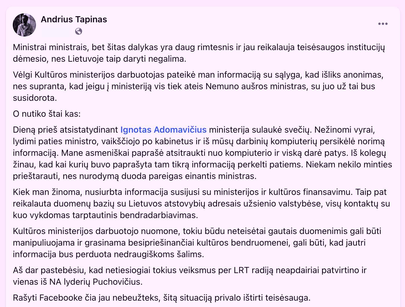 Kultūros ministerijos darbuotojo nuomone, tokiu būdu neteisėtai gautais duomenimis gali būti manipuliuojama ir grasinama besipriešinančiai kultūros bendruomenei, gali būti, kad jautri informacija bus perduota nedraugiškoms šalims. Aš dar pastebėsiu, kad netiesiogiai tokius veiksmus per LRT radiją neapdairiai patvirtino ir vienas iš NA lyderių Puchovičius. Rašyti Facebooke čia jau nebeužteks, šitą situaciją privalo ištirti teisėsauga“, - visuomeniniuose tinkluose parašė A. Tapinas.
