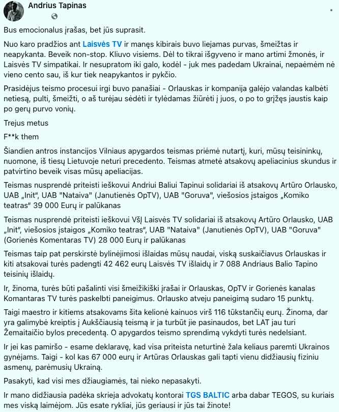 Vilniaus apygardos teismas paskelbė sprendimą, kuriuo žurnalistas Andrius Tapinas ir jo įkurta viešoji įstaiga „Laisvės TV“ laimėjo bylą prieš Artūrą Orlauską ir kelias žiniasklaidos įmones.