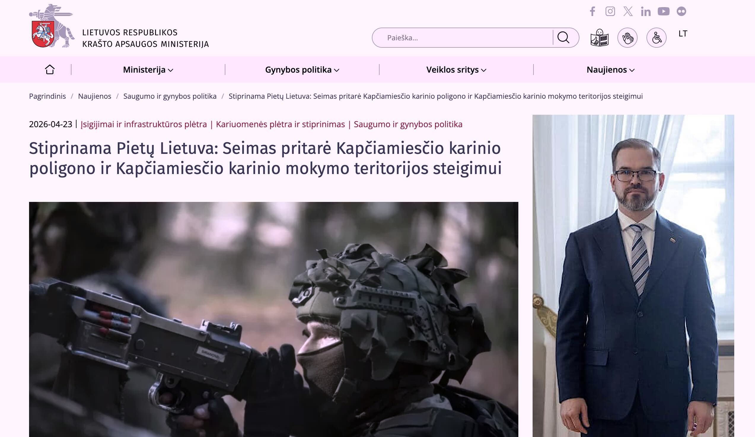 „Pasiruošęs karys yra vienas svarbiausių veiksnių priešo atgrasymui ir krašto gynybai, o Kapčiamiesčio poligono įsteigimas sustiprins visos Lietuvos apginamumą. Nuo pat pradžių klausėmės vietos gyventojų, ieškojome kompromisų ir juos radome. Esame dėkingi patriotiškiems piliečiams, bendruomenių nariams ir Lazdijų rajono savivaldybei už konstruktyvų bendradarbiavimą. Absoliuti dauguma Lietuvos gyventojų supranta, kad stipri kariuomenė prisideda prie mūsų visų saugumo – sprendimą steigti naują poligoną remia du trečdaliai šalies gyventojų“, - pasakė Krašto apsaugos ministras Robertas Kaunas.