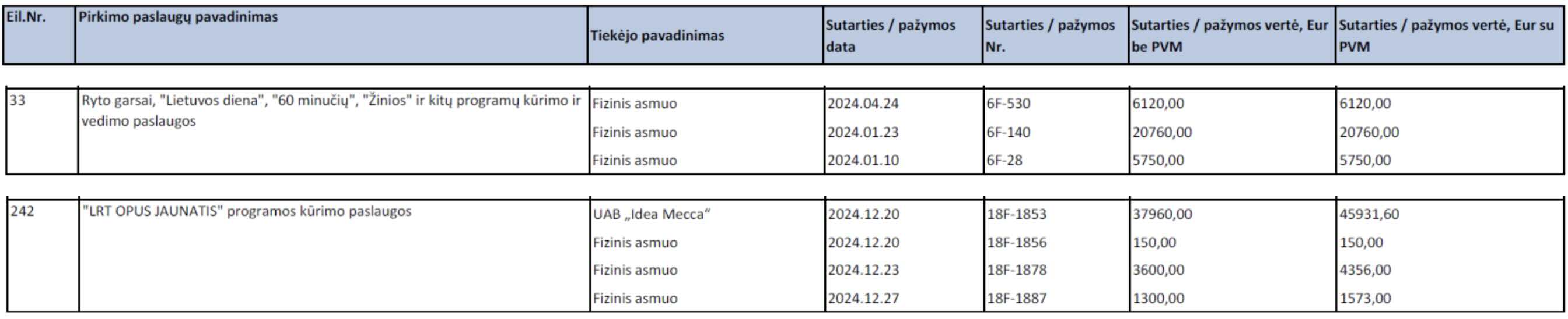 - Audito metu atsirinkti ir vertinti programų, jų sukūrimo, gaminimo pirkimai pateikiami ataskaitos 17 priede. Atsirinkti 5 pirkimai (iš 2560), kurie buvo vykdyti neskelbiamos apklausos būdu. Nustatėme, kad 3 pirkimų vykdymas neskelbiamos apklausos būdu kreipiantis į konkretų (-ius) tiekėją (-jus) neatitiko Radijo ir audiovizualinės žiniasklaidos programų, jų sukūrimo, gaminimo ir transliavimo eteryje laiko pirkimų tvarkos aprašo (toliau – Aprašas) nuostatų, nes paslaugas galėjo teikti ne tik pasirinktas konkretus tiekėjas, t. y. fiziniai asmenys, kurių vardus ir pavardes LRT nurodė kaip konfidencialią informaciją, todėl jų atskleisti negalime. Pateikiame šių 3-jų pirkimų neskelbiamų apklausų ataskaitose pateiktą informaciją (Pirkimo Nr. 242 „LRT OPUS JAUNATIS“ programos kūrimo paslaugos atveju nustatėme, kad tik fizinių asmenų pasirinkimas kreipiantis į konkrečius tiekėjus neužtikrino Aprašo nuostatų reikalavimų dėl programos kūrimo paslaugų, o juridinio asmens atitiko, nes UAB „Idea Mecca“ priklauso „LRT OPUS PILNATIS“ programos autorinės teisės):