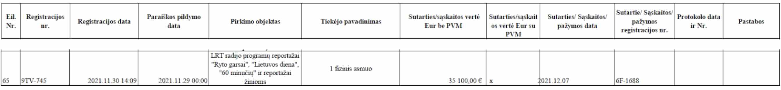 2021 m. pirkimas (Nr. 65), kurio objektas sukurti LRT Radijo programoms rubriką (-as) / reportažą (-us), LRT radijo žinioms reportažo (-ų) literatūrinės dalies scenarijų bei sukurti ir atlikti programos vedėjo vaidmenį, vykdytas neskelbiamos apklausos būdu, vadovaujantis Aprašo 118.4.2 ir 118.4.4¹ p., nes, LRT teigimu, pirkimo vertė neviršijo 58 000 Eur be PVM ribos, todėl buvo kreiptasi į konkretų tiekėją dėl teikiamų paslaugų specifikos, kompetencijų ir turimos patirties rengiant reportažus, siekiant išlaikyti socialinių temų tęstinumą, į jas yra įsigilinęs būtent pasirinktas autorius. Vertinama, kad sąlygos netenkina Apraše nustatytų priežasčių, t. y. paslaugas teikti galėjo ne tik pasirinktas konkretus tiekėjas.