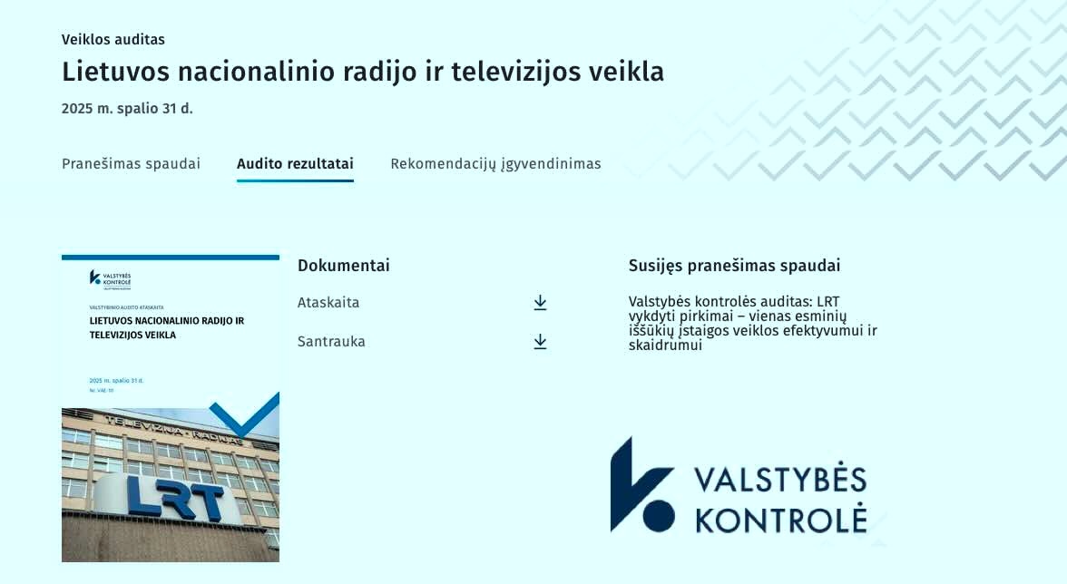 2025 m. atliktas Lietuvos nacionalinio radijo ir televizijos (LRT) 2021–2024 m. veiklos auditas atskleidė įvairių sričių, kuriose buvo nustatyta trūkumų, įskaitant programų kūrimo ir gamybos pirkimų skaidrumą. Audito ataskaita viešinama, tačiau pateikiama informacija apie konkrečias sutartis, jų turinį bei tiekėjus yra bendro pobūdžio.