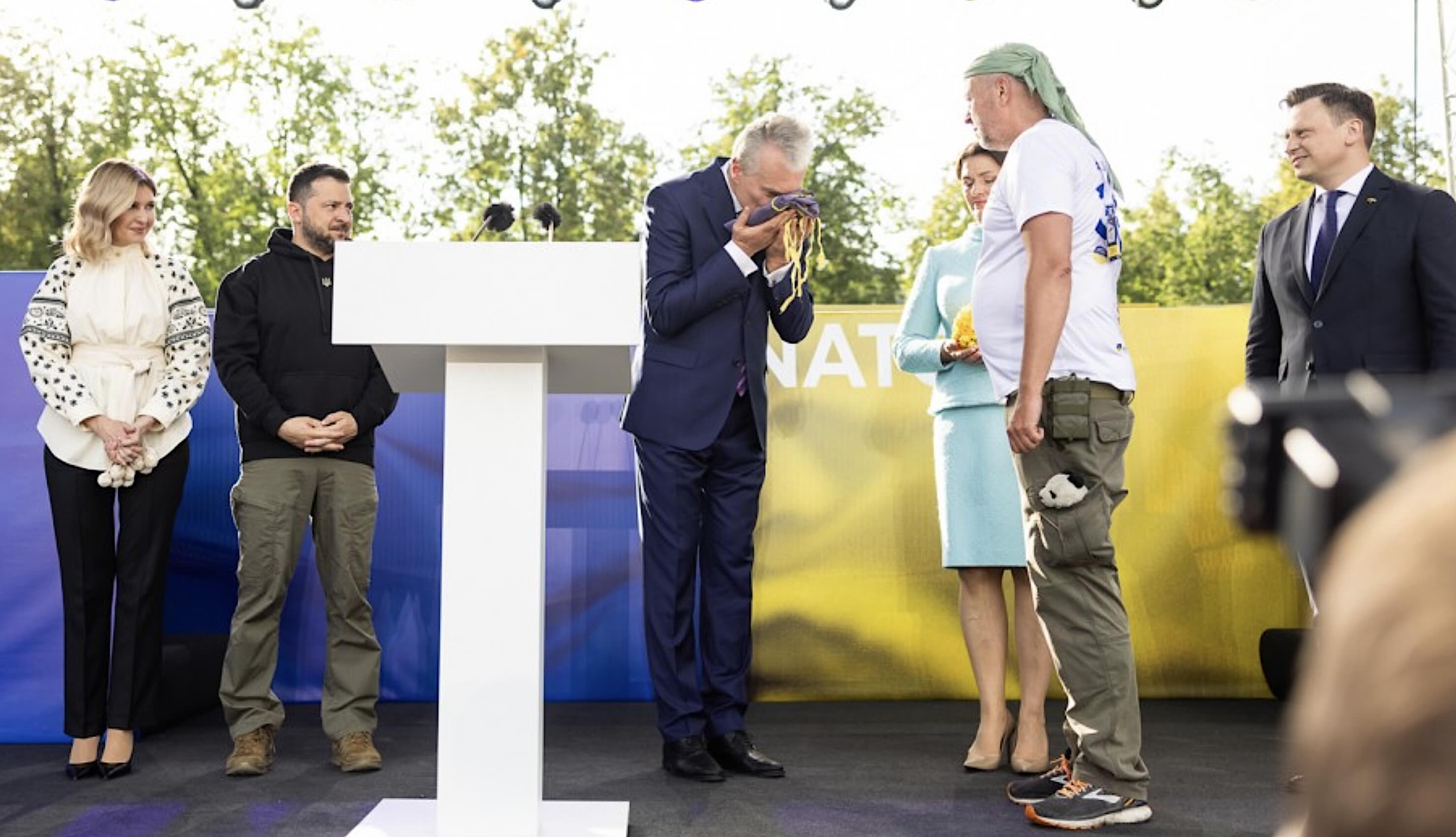 | Istorinis 2023 metų bučinys, kai Gerovės valstybės kūrėjas Gitanas Nausėda Vilniaus centre bučiavo Ukrainos vėliavą, taip, kaip pats vėliau informavo, pabučiuodamas Ukrainos karių kraują. |