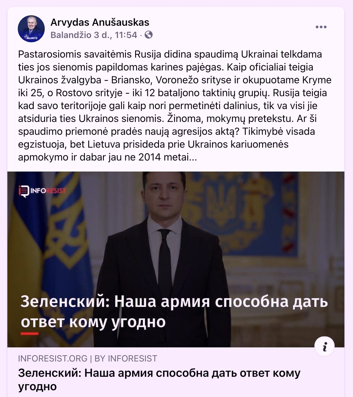 Krašto apsaugos ministras, labiau žinomas kaip anušauskinių KGB sąrašų skelbėjas, Arvydas Anušauskas pranešė, kad „pastarosiomis savaitėmis Rusija didina spaudimą Ukrainai telkdama ties jos sienomis papildomas karines pajėgas“.