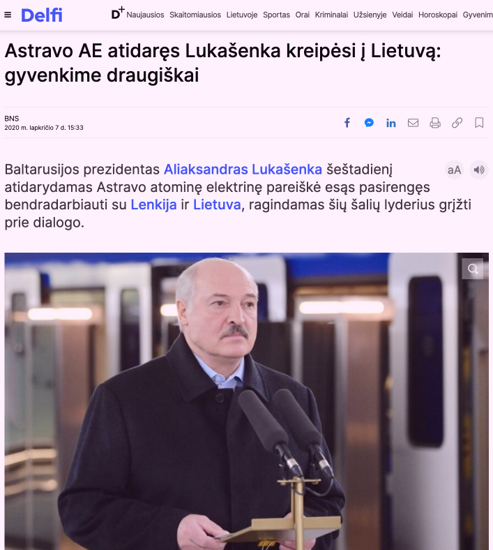 Tariamas Baltarusijos prezidentas Aleksandras Lukašenka, kažkodėl naujienų firmos BNS bei nepriklausomo Žmonių partijos portalo vėl vadinamas prezidentu, lapkričio 7 d. atidarydamas Baltarusijos atominę elektrinę (BAE) pareiškė esąs pasirengęs bendradarbiauti su Lenkija ir Lietuva, ragindamas šių šalių lyderius grįžti prie dialogo.