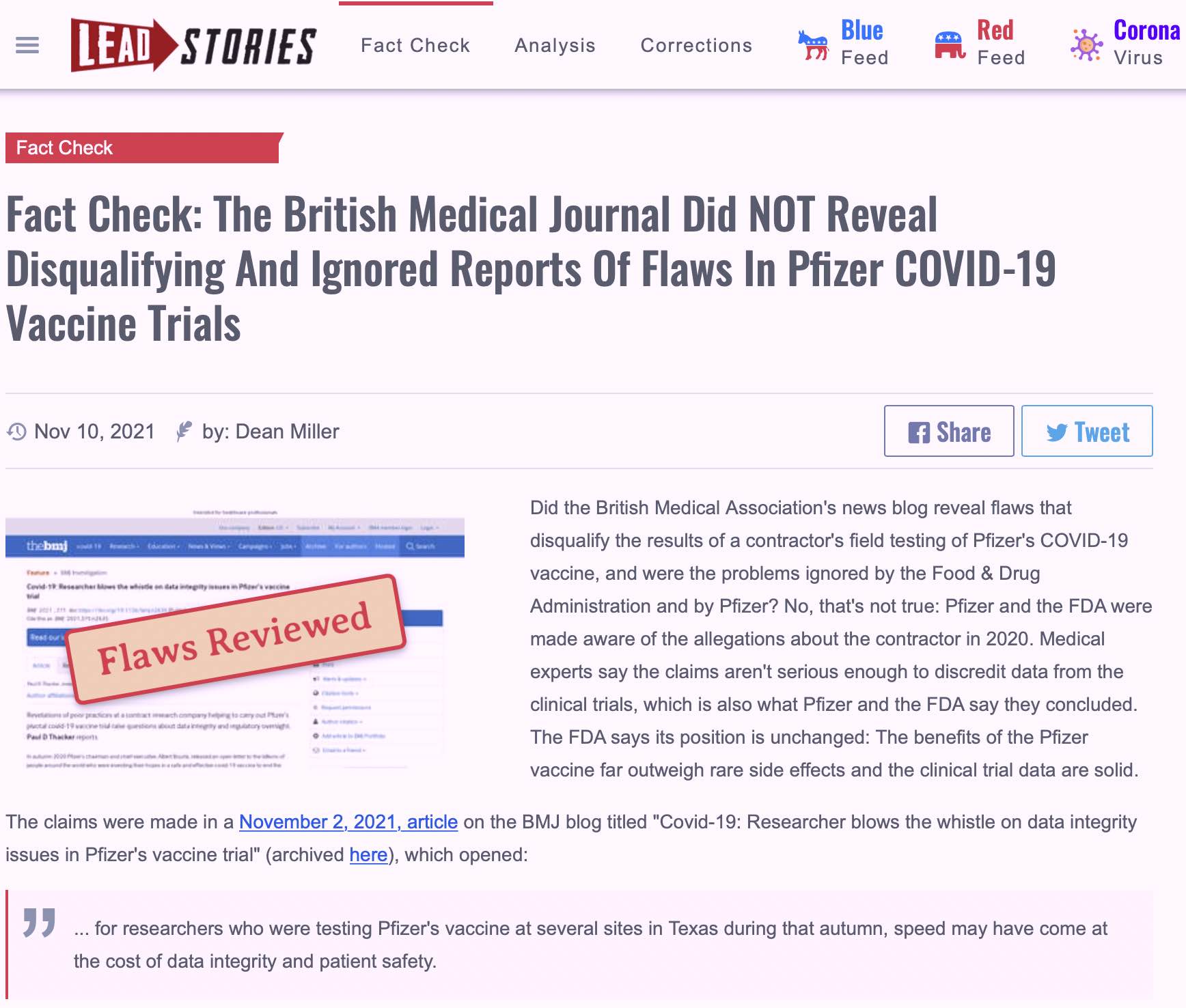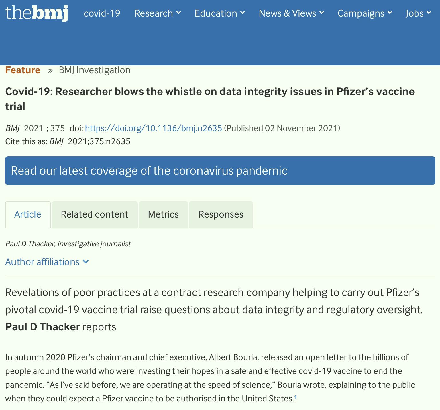Medicinos mokslo žurnalas The British Medical Journal (BMJ) lapkričio 2 d. publikavo straipsnį, kuriame pateikiami duomenys apie Pfizer vakcinos nuo Covid-19 ligos klinikinių tyrimų falsifikavimą ir neatitikimą tyrimo standartų reikalavimams.