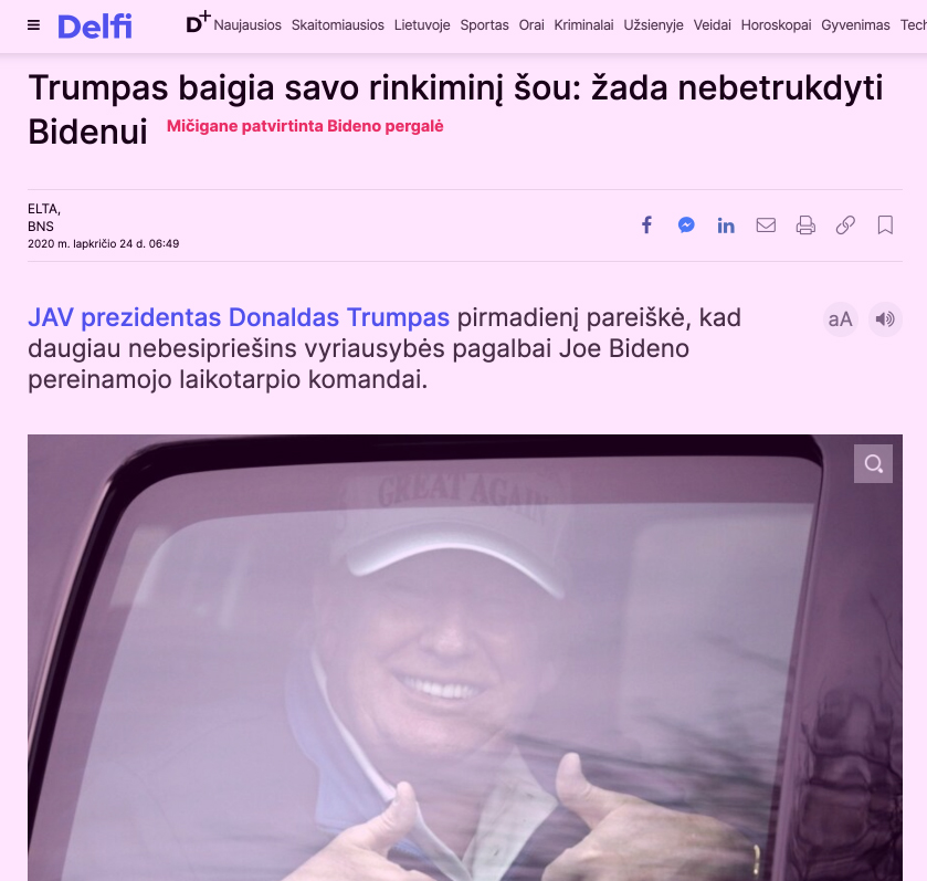 Nepriklausomas Žmonių partijos portalas cituodamas firmos BNS pranešimą informavo, kad vis dar pareigas einantis JAV prezidentas Donaldas Trampas (Donald Trump) lapkričio 23 d. pareiškė, kad daugiau nebesipriešins vyriausybės pagalbai naujai išrinkto JAV prezidento Džo Baideno (Joe Biden) pereinamojo laikotarpio komandai.
