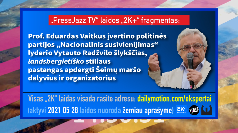 Jūsų dėmesiui gegužės 28 d. „PressJazz TV“ laidos „2K+“ fragmentas (visą laidą galima žiūrėti ČIA) – pokalbis su Šeimų maršo dalyviu, kalbą gegužės 15 d. mitinge sakiusiu profesoriumi, hematologu Eduardu Vaitkumi. Tiesa, E. Vaitkus pokalbį pradėjo visai nuo kitos temos: