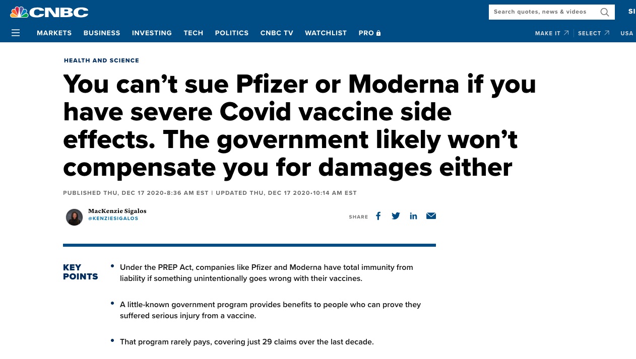 Jungtinių Valstijų valdžia nutarė, kad vakcinų nuo koronaviruso gamintojai Pfizer bei Moderna neneš jokios atsakomybės, jei dėl šių vakcinų šalutinio poveikio nukentės žmonių sveikata.