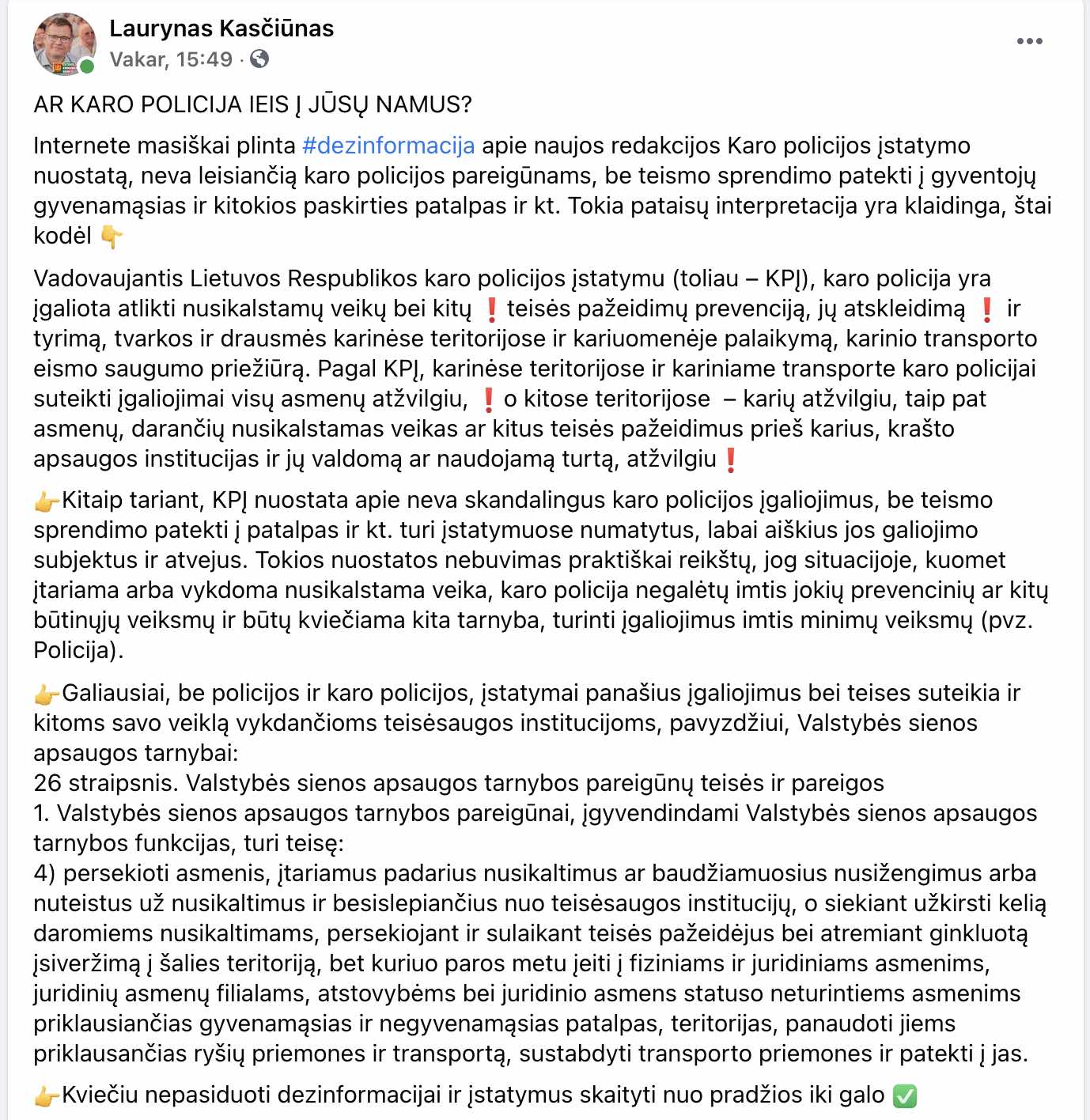 Savo įžvalgomis visuomeniniuose tinkluose apie nuo 2021 m. sausio 1 d. įsigaliosiantį naująjį Karo policijos įstatymą, pasidalino Žmonių partijos atstovas Laurynas Kasčiūnas.