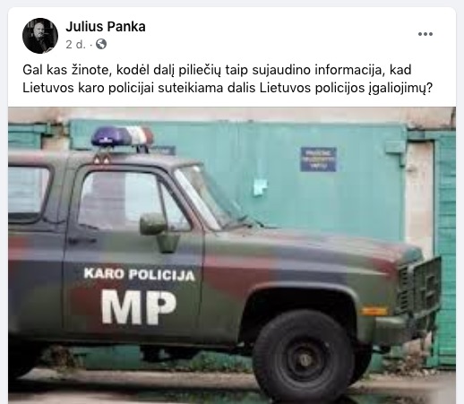 „Gal kas žinote, kodėl dalį piliečių taip sujaudino informacija, kad Lietuvos karo policijai suteikiama dalis Lietuvos policijos įgaliojimų?“, - visuomeniniuose tinkluose klausimą iškėlė J. Panka.