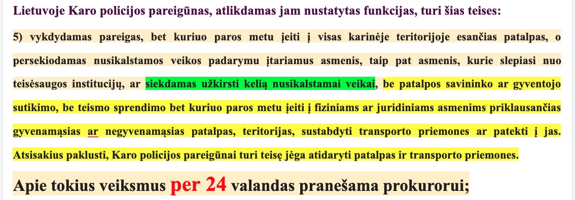 Pavyzdžiui Lietuvoje, karo policininkas be teismo sprendimo svečiuodamasis pas civilį namuose, laisvai galės su bendrauti su juo net iki 24 valandų ir tik tada pranešti prokurorui.