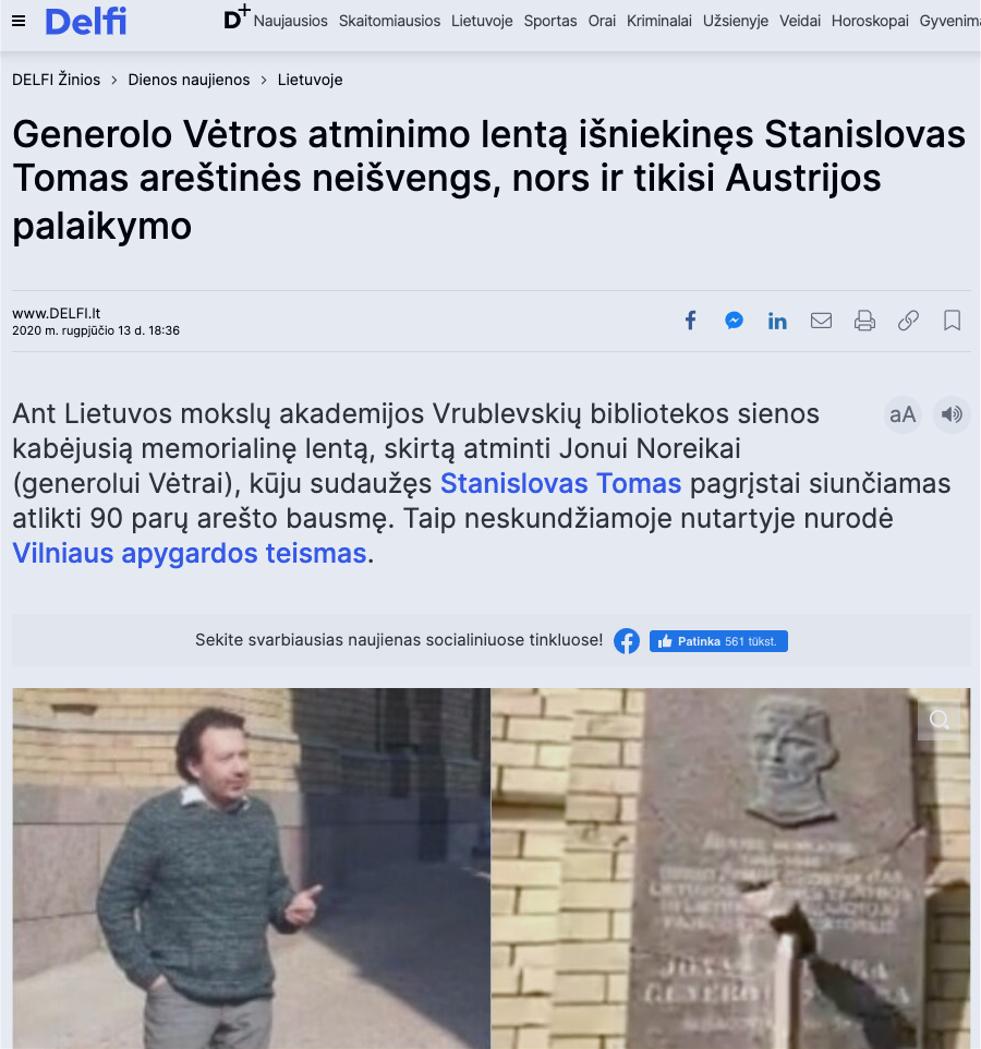 Šią žinią rugpjūčio 13 d. paviešino ir nepriklausomas Žmonių partijos portalas publikacijoje „Generolo Vėtros atminimo lentą išniekinęs Stanislovas Tomas areštinės neišvengs, nors ir tikisi Austrijos palaikymo“.