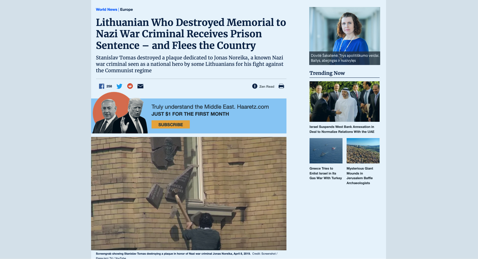 Štai kas rašoma rugpjūčio 13 d. straipsnyje „Lithuanian Who Destroyed Memorial to Nazi War Criminal Receives Prison Sentence – and Flees the Country“: