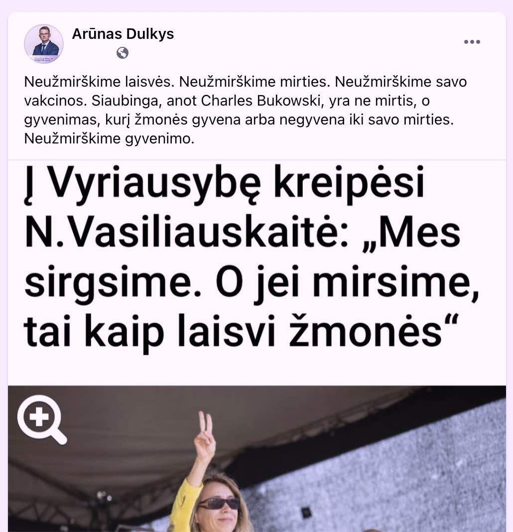 „Neužmirškime laisvės. Neužmirškime mirties. Neužmirškime savo vakcinos. Siaubinga, anot Charles Bukowski, yra ne mirtis, o gyvenimas, kurį žmonės gyvena arba negyvena iki savo mirties. Neužmirškime gyvenimo“, - visuomeniniuose tinkluose Lietuvos žmones informavo A. Dulkys.