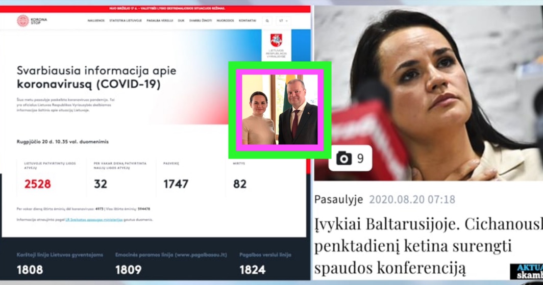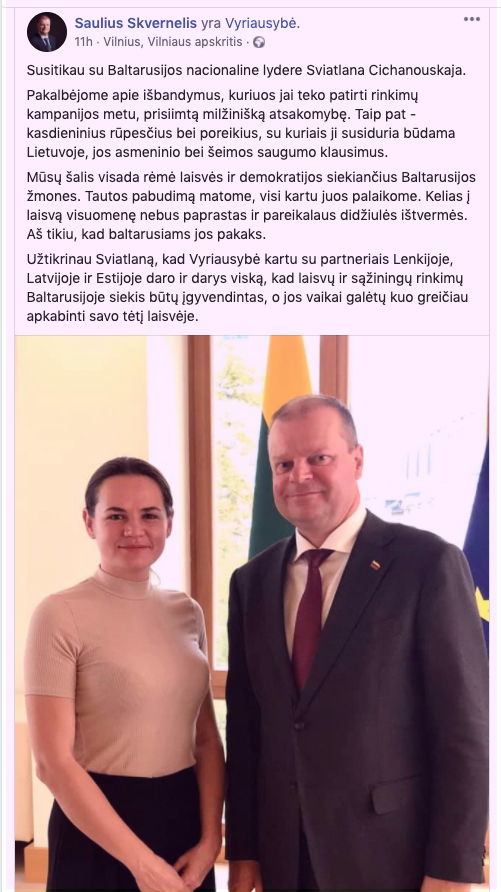 Tačiau jau rugpjūčio 20 d. Vyriausybės rūmuose Lietuvos premjeras Saulius Skvernelis, net nesilaikydamas nustatyto saugaus dviejų metrų atstumo, maloniai paveikslavosi su naująja Baltarusijos vadove ir pats paskelbė šią nuotrauką visuomeniniusoe tinkluose.