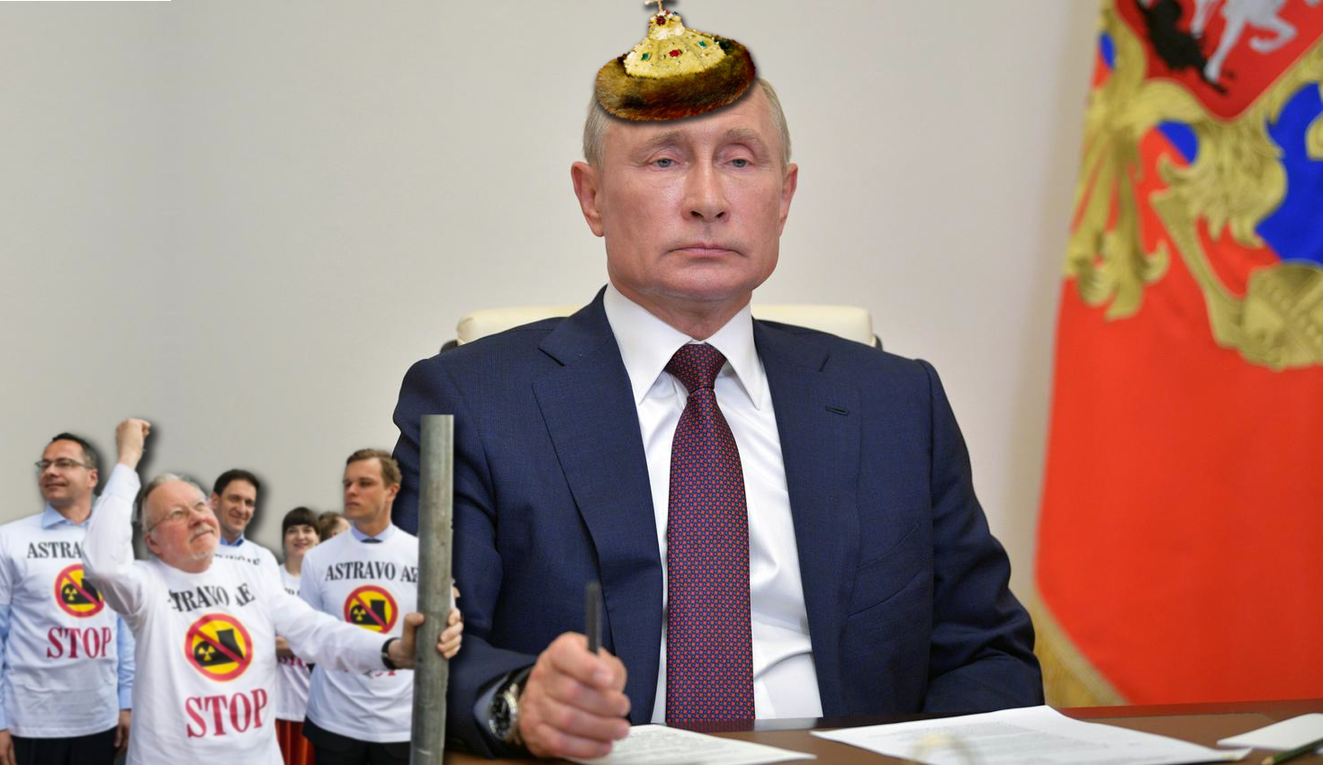 | Jei Rusijos prezidentas Vladimiras Putinas išdrįstų atvykti į Baltarusiją pasižiūrėti naujos atominės, jo lauktų nemaloni staigmena – netoliese, maždaug 50 km nuo objekto jį pasitiktų gausus demokratiškai nusiteikusių protestuotojų būrys. Tautodailininko Kęstučio Timoškino vizualinis darbas „CARAS ir BURLIOKAI“. |