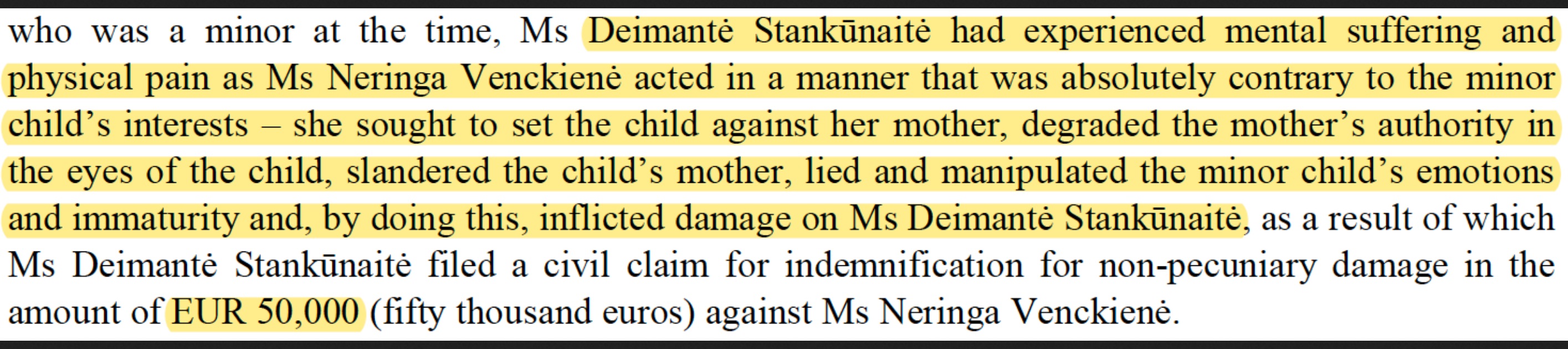 „Lietuvos vyriausybė Jungtinėms Tautoms teigia, kad „panelė Deimantė Stankūnaitė (Kedytė – ekspertai.eu past.) patyrė psichologinį smurtą ir fizinį skausmą, kai ponia Neringa Venckienė veikė visiškai priešingai nepilnametės mergaitės interesams: ji siekė nukreipti mergaitę prieš motiną, pažemino motinos autoritetą mergaitės akyse, šmeižė mergaitės motiną, melavo ir manipuliavo nepilnamečio vaiko emocijomis bei nebrandumu, o taip elgdamasi padarė žalą panelei Deimantei Stankūnaitei, ko pasekoje ji padavė poniai Neringai Venckienei civilinį ieškinį neturtinės žalos atlyginimui, įvertintam 50 000 eurų“, - Jungtinių Tautų raštą cituoja advokatas profesorius Stanislovas Tomas.