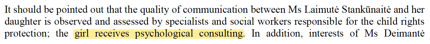Savo gynybiniame rašte Lietuvos vyriausybė nepateikė įrodymų, kad Deimantė yra sveika. Atsisakė nurodyti jos buvimo vietą arba leisti su ja susitikti. Tačiau, vyriausybė pranešė, kad mergaitei teikiama psichologinė pagalba (prikabinu ištrauką). Vyriausybė neįvardino tikslios diagnozės, nustatytos vaikui“, - informavo S. Tomas.
