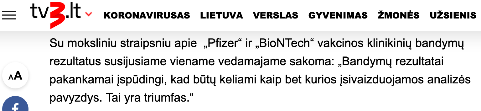 Tad Lietuvoje nekantriai laukiant atvykstant įvairių gamintojų, tame tarpe ir firmos „Pfizer“, vakcinų nuo pasaulinės koronaviruso pandemijos,, „Pfizer-BioNTech“ vakcinos nuo koronaviruso bandymų rezultatai paskelbti mokslo medicinos žurnale „New England Journal of Medicine“.