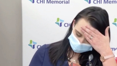 Jauna moteris žurnalistams pasakodama savo įspūdžius apie skiepijimąsi, iš džiaugsmo ir laimės tiesiog nualpo.
