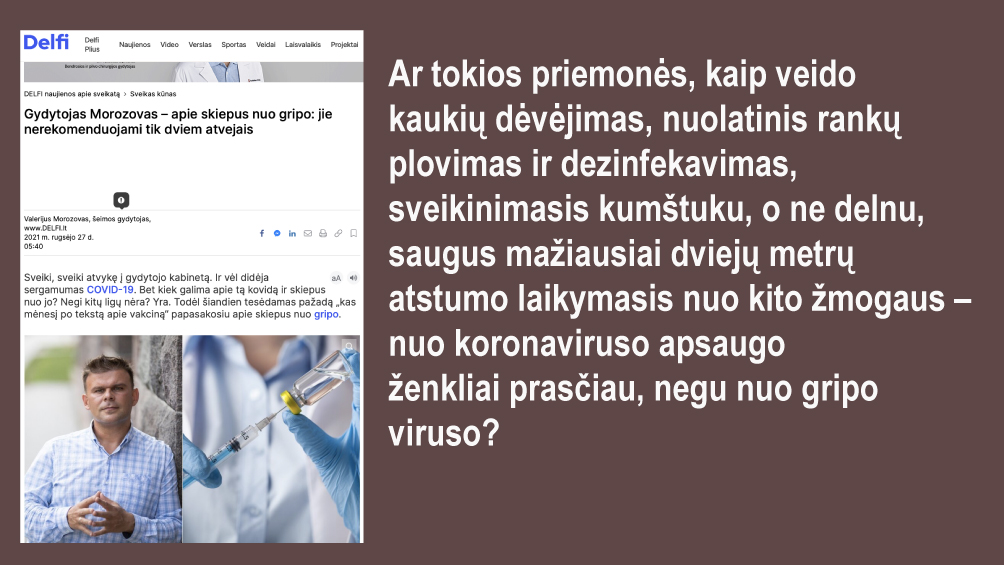 Kodėl kaukės, rankų priežiūra, dviejų metrų atstumas labai gerai saugo nuo gripo, bet ne nuo koronaviruso?