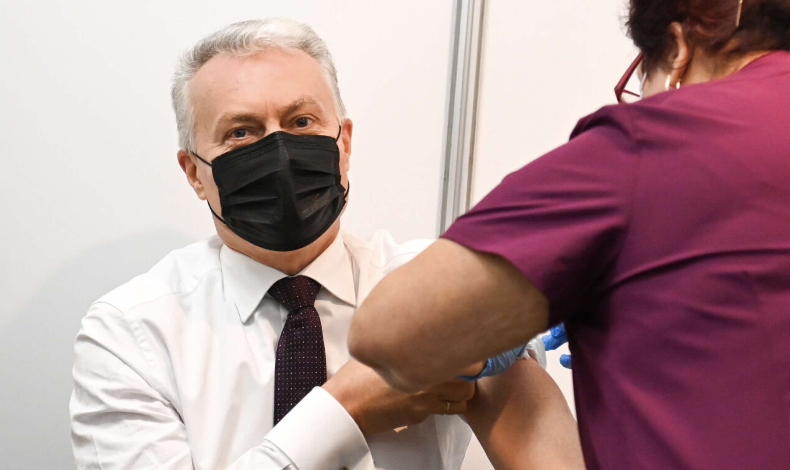 | Akimirka, kai G. Nausėda stiprinasi sustirinamąja medicininio preparato nuo COVID-19 ligos. Nuotr. prezidentas.lt |