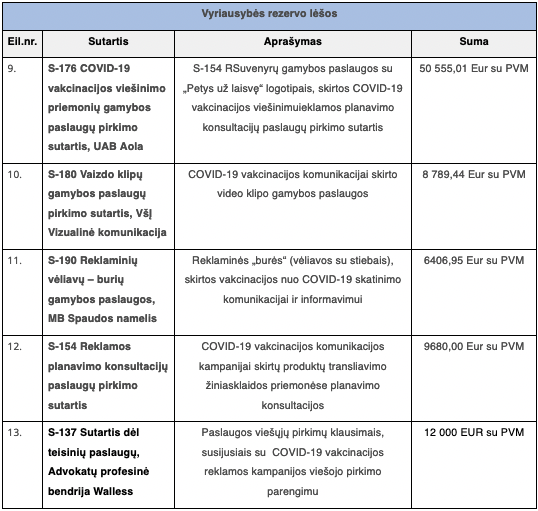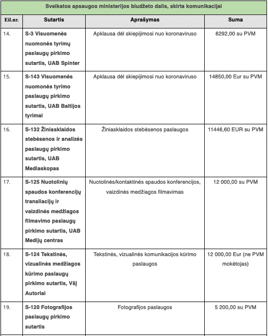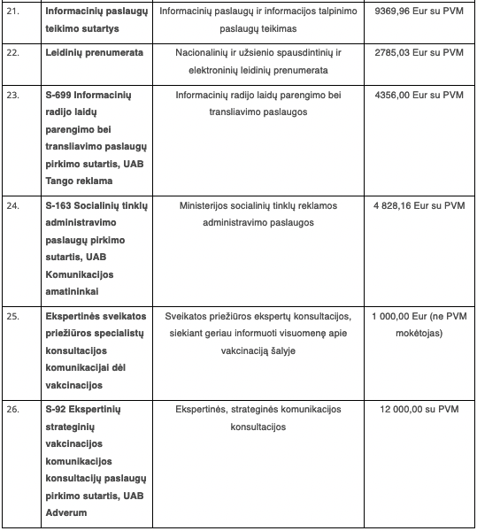 „Viešojoje erdvėje kilus susidomėjimui Sveikatos apsaugos ministerijos pastaruoju metu vykdytais viešaisiais pirkimais, pateikiame viešųjų pirkimų, vykdytų per 2021 m., finansuojamų Valstybinio visuomenės sveikatos stiprinimo fondo lėšomis, Vyriausybės rezervo lėšomis ir Sveikatos apsaugos ministerijos biudžeto lėšomis, skirtomis komunikacijai, ataskaitą. Primename, kad ši informacija taip pat yra viešai prieinama visuomenei Viešųjų pirkimų tarnybos tinklalapyje“, - rašoma SAM pranešime.