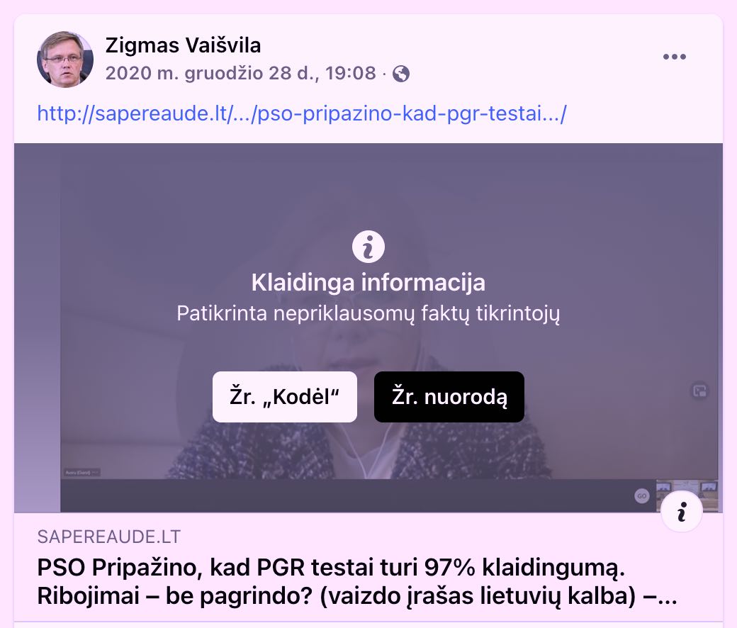 Ir pateikta nuoroda, kaip šie „nepriklausomi tikrintojai“ tai tikrino: – „Pasidalijo melagienomis: tikina, kad testai COVID-19 nustatyti 97 proc. atvejų klysta“.
