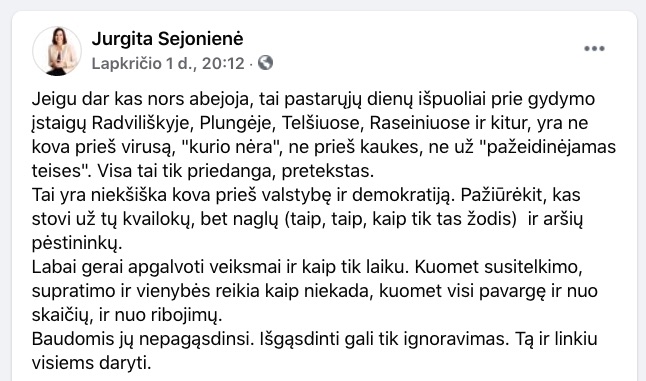 Visuomeniniuose tinkluose J. Sejonienė taip pat paliko mįslingą įrašą apie pulančius valstybę priešus: