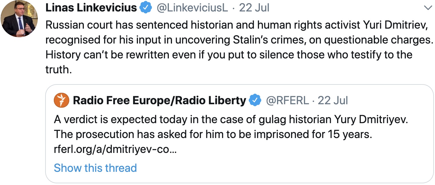Taigi, pagal L. Linkevičiaus logiką, Vladimiras Putinas visa tai daro tam, kad perrašytu istoriją – t. y. užčiauptų J. Dmitrijevo stalinizmo kritiką…
