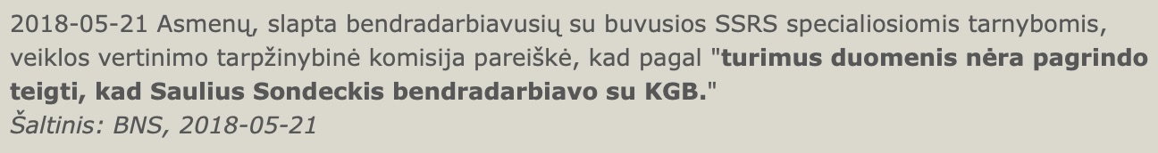 T.B. Burauskaitės atsakymas negalėjo nesužavėti – moteris itin lakoniškame atsakyme informavo, kad šioje svetainė po šmeižtu apie S. Sondeckį yra patalpinta ciatata iš vienos naujienų agentūros pranešimo, kuri skamba taip: