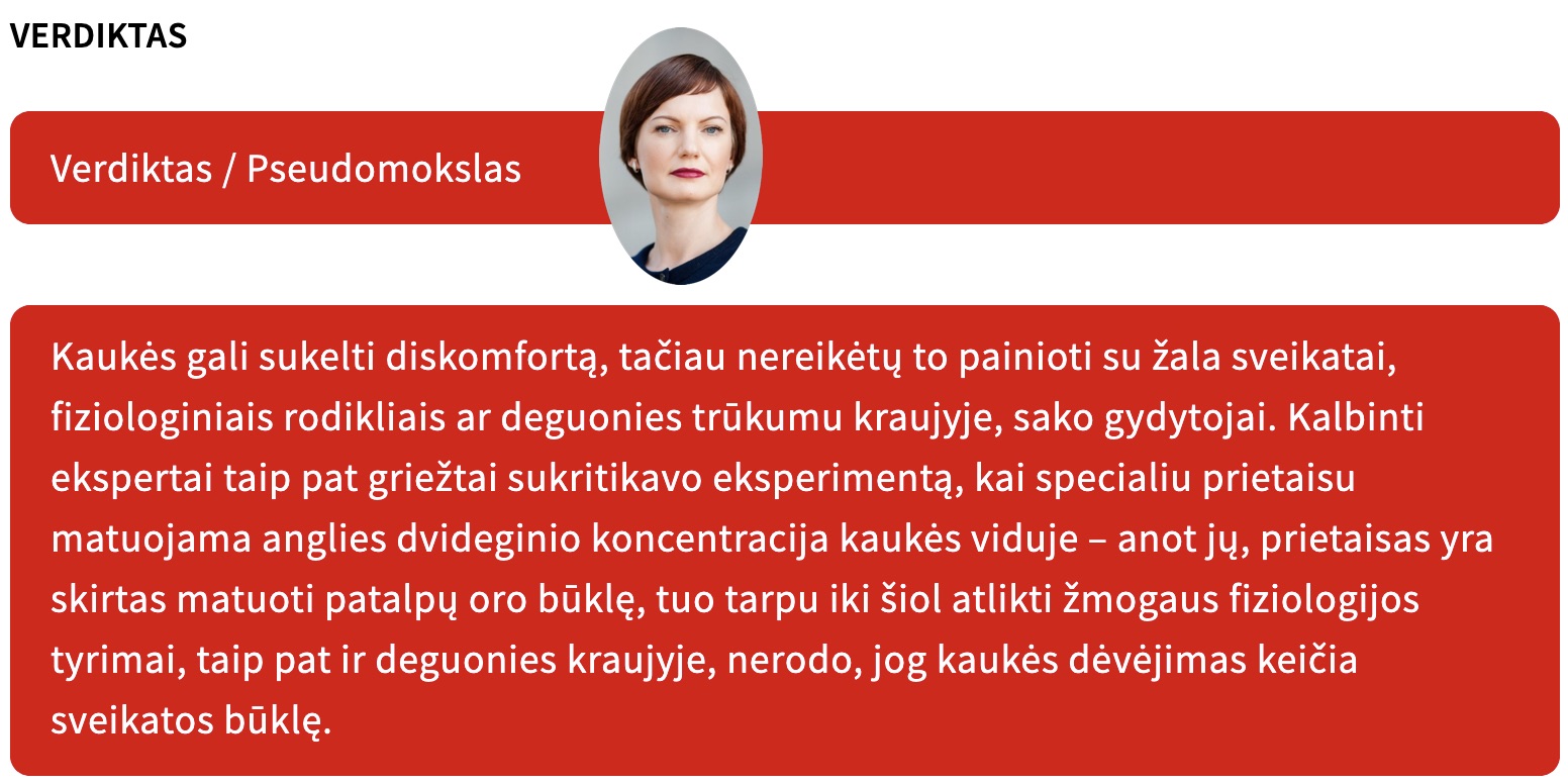 „Tie eksperimentai, kur yra tiriama arba deguonies koncentracija, arba anglies dvideginio koncentracija, yra netinkami, todėl kad tie prietaisai, kurie naudojami, yra skirti ne tam, matuoti dujų koncentracijas patalpose, o ne iškvėptame ore. Dėl to jų vertinti negalima, nes jie tikrai nerodo taisyklingų skaičių“, - pasako gydytoja pulmonologė Vaiva Kumpauskaitė.