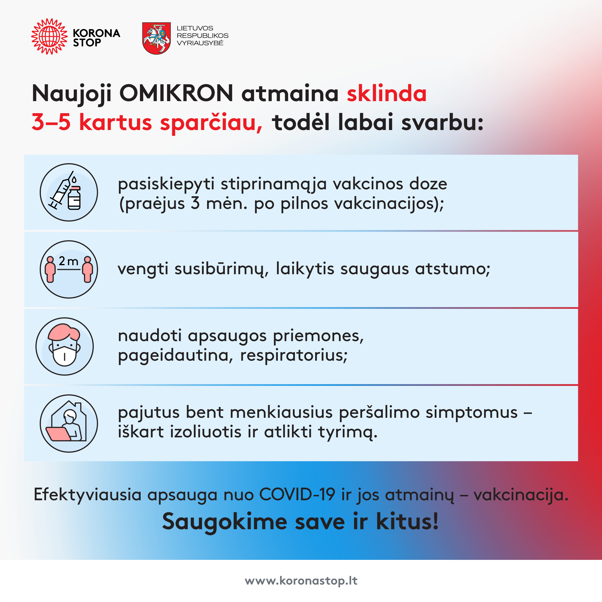 „Mokslininkų duomenimis, atsparumą omikron ir kitoms COVID-19 atmainoms labiausiai didina vakcinacija, todėl kviečiame Lietuvos gyventojus nedelsti – skiepytis stiprinamąja doze galima praėjus 3 mėnesiams po pasiskiepijimo pagal visą skiepijimo schemą“, - atkreipia dėmesį Vyriausybės kanclerė Giedrė Balčytytė.